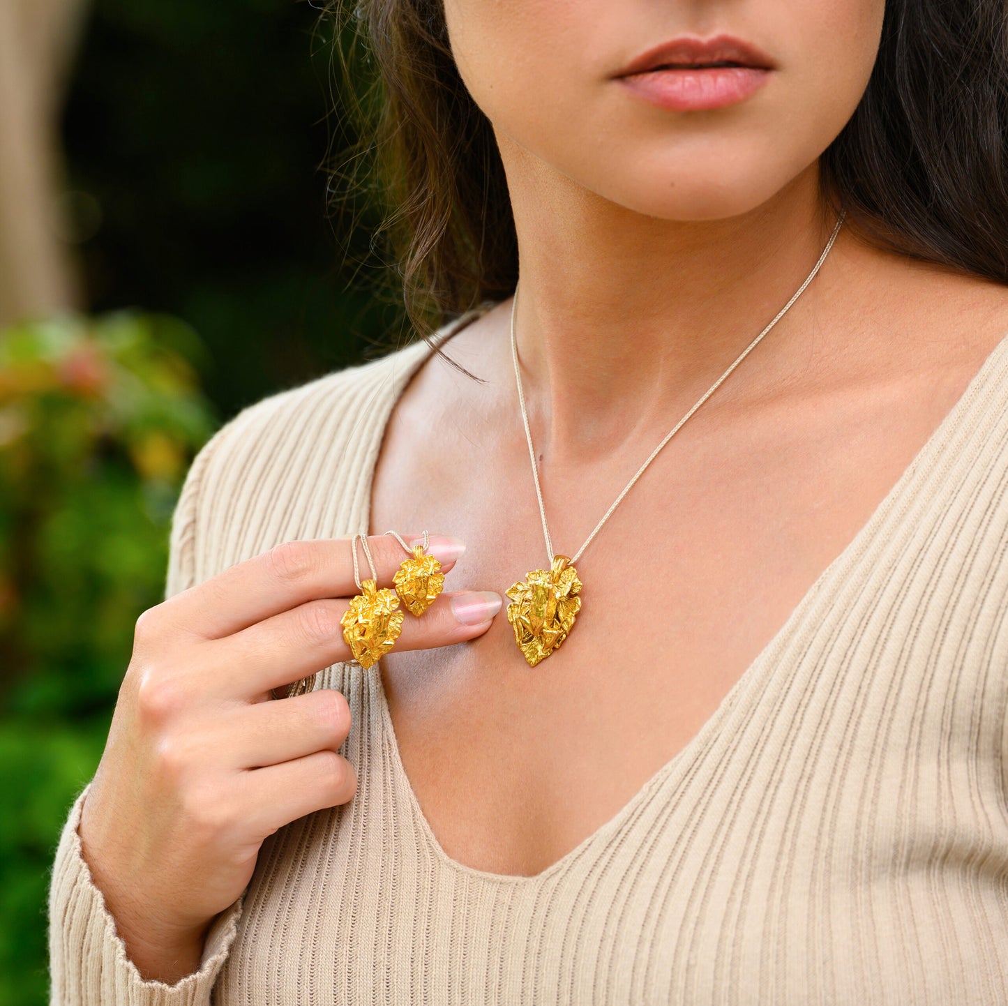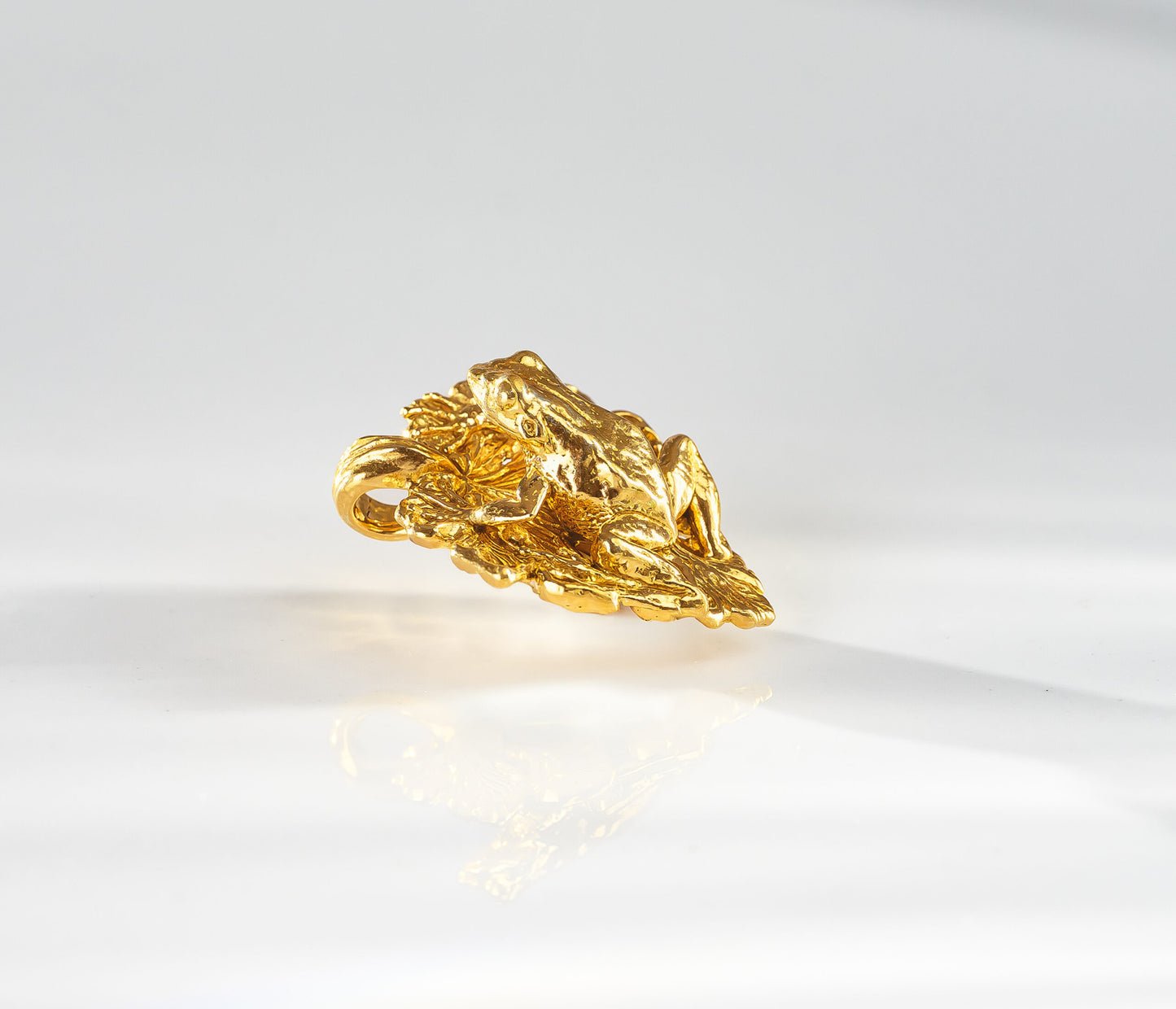 Discover the enchanting beauty of nature captured in pure elemental gold with this exquisite Frog on Leaf Pendant. Meticulously handcrafted from 99.99% pure 24-karat gold in our USA workshop, this anatomically perfect rendering celebrates the timeless symbolism of transformation and good fortune. The clever design allows the piece to hang with flawless balance, ensuring nothing interferes with its organic beauty as it catches and reflects light with every movement.